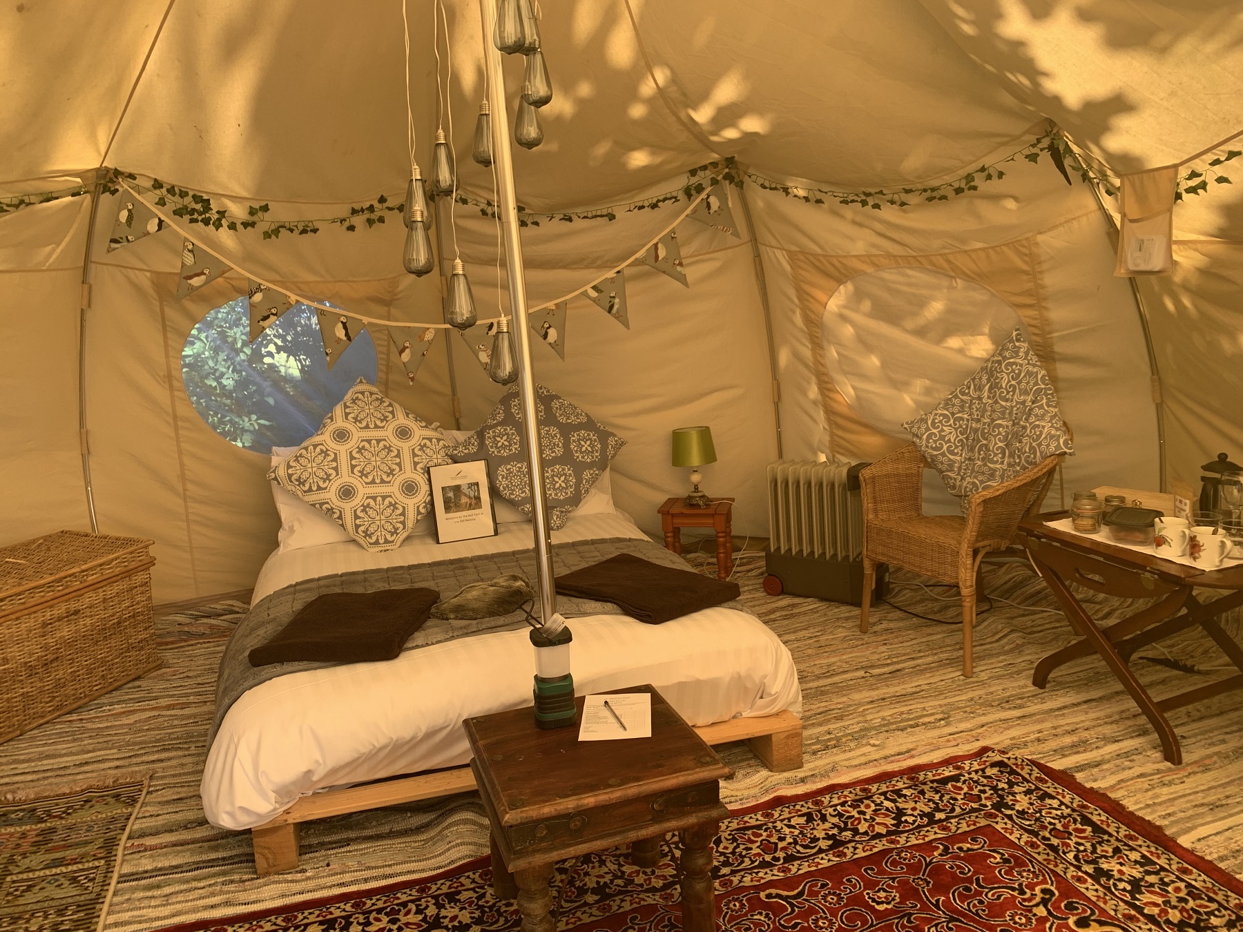 Get closer to nature at the Old Rectory in our self catering glamping Bell Tent. This spacious 6m tent features a comfortable double bed, with duvet and luxurious throws and a wood burning stove to keep you cozy at night. A newly constructed shower and toilet for your exclusive use are situated 50m from the tent in the Rectory's old 'netty' and dovecotte. The tent looks out across neighbouring fields and has a private bbq and seating area. There is a minimum three nights stay between April and September.